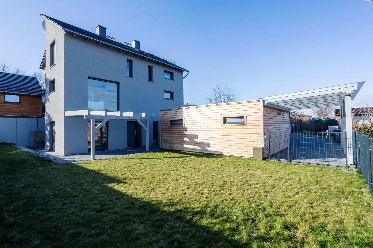 Bei der Planung dieses geräumigen Hauses mit angeschlossener Doppelgarage wurde berücksichtigt, dass das Erdgeschoss als altersgerechter Wohnraum genutzt werden kann und das Obergeschoss als Gäste- und Arbeitsbereich dient. Das Gebäude, welches mit Mineralwolle gefüllten Porotonziegeln in 42,5 cm Stärke hergestellt wurde, übertrifft die neuesten Anforderungen des Wärmeschutzes und das, obwohl es schon 2017 entstanden ist. Die Gesamtwohnfläche beträgt ca. 198 m².